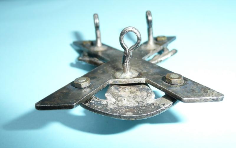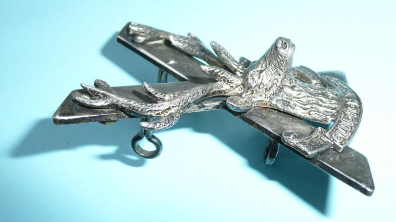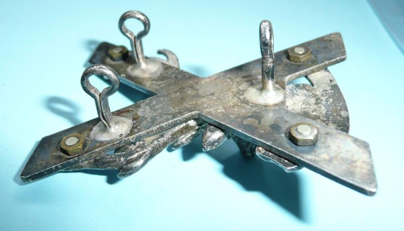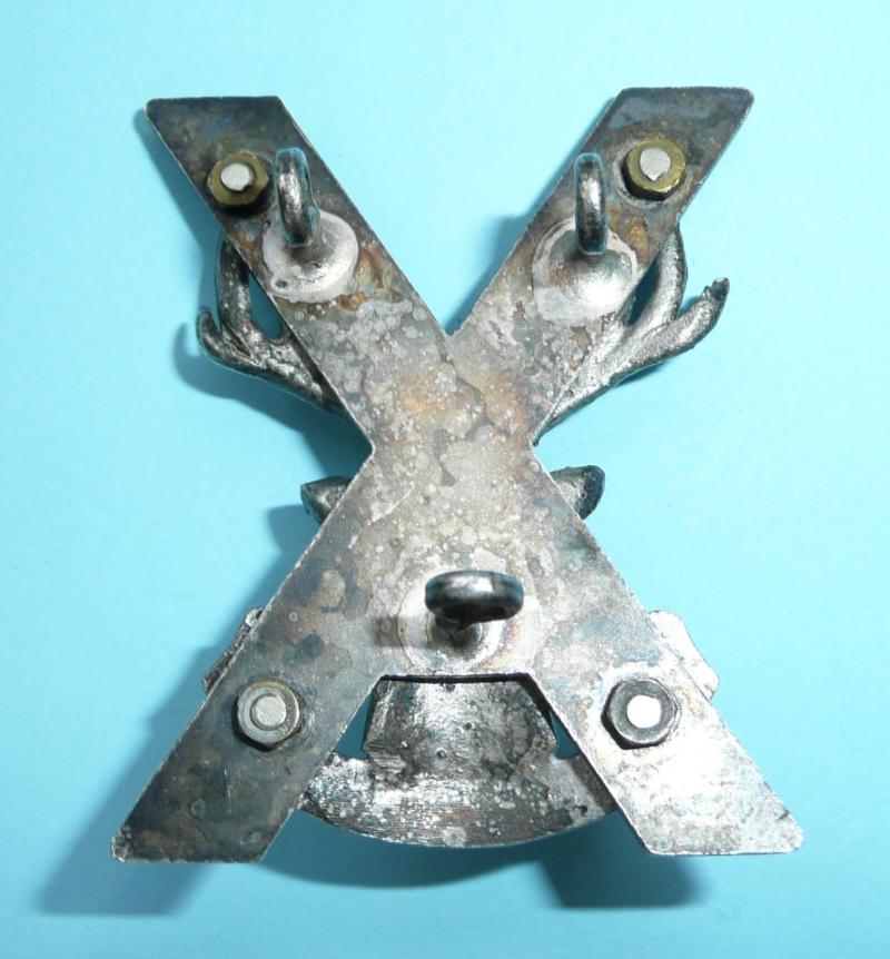 A die cast silver plated example of two part construction in the form of a 3-D Stag's head above a 'Cuidich'n Righ' scroll superimposed on a saltire. Commonly known as a 'crucified moose' among the troops. Three of three original loops to the reverse. Sligh service wear and tarnishing otherwise in very good condition. Worn circa 1958-69.