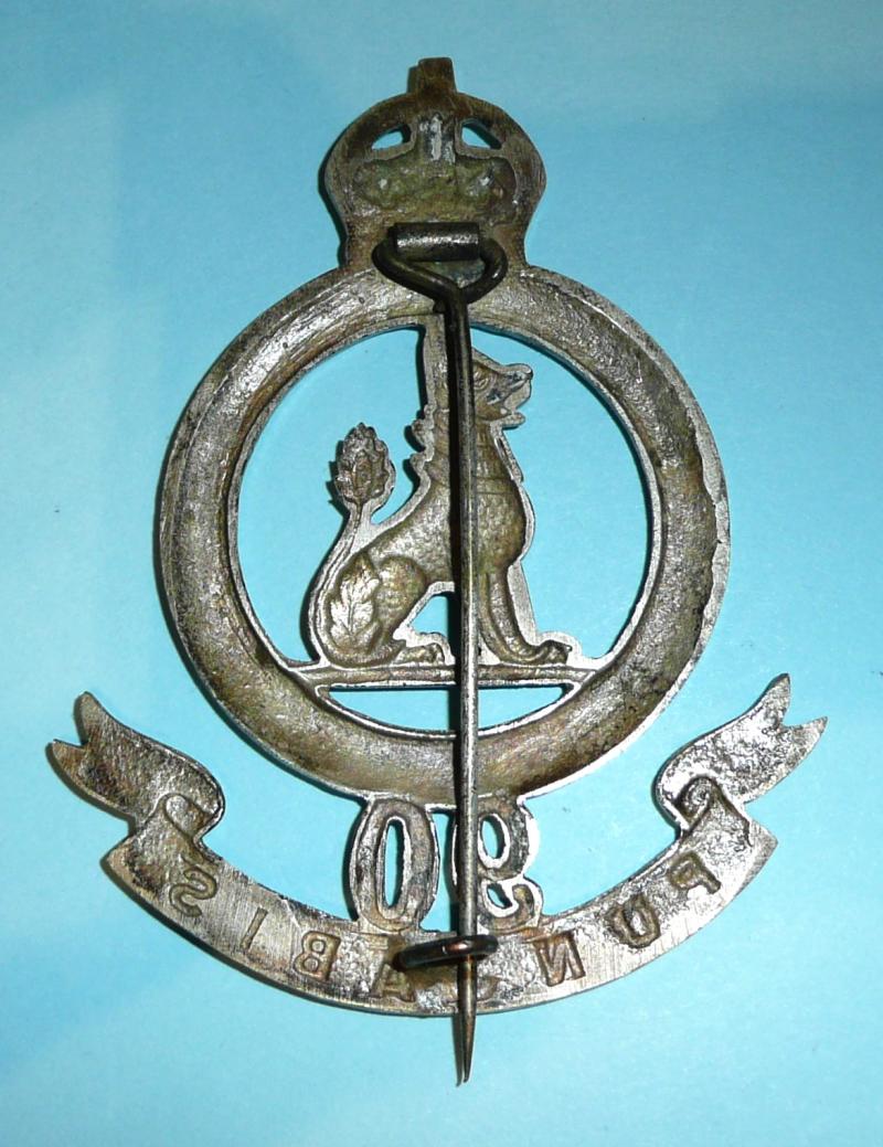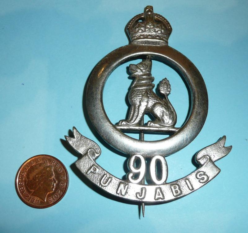 A large and impressive other ranks quality pagri badge in cast white metal, looks to have been silver-plated, depicting a crowned quoit with a seated Chinthern to voided centre, '90' below and a scroll 'Punjabis', stout pin back with original fittings. Circa 7.2cms tall. Worn circa 1903-1922.