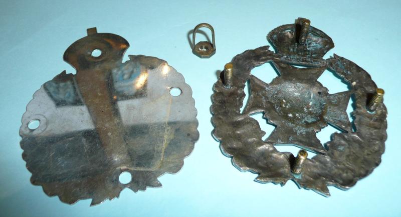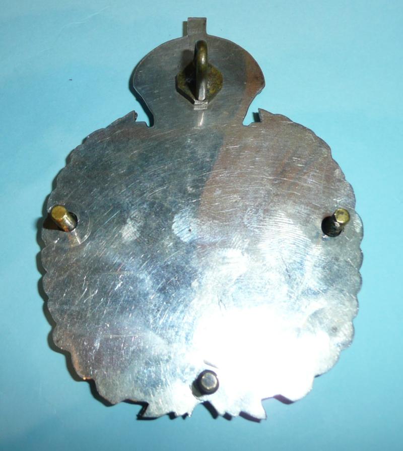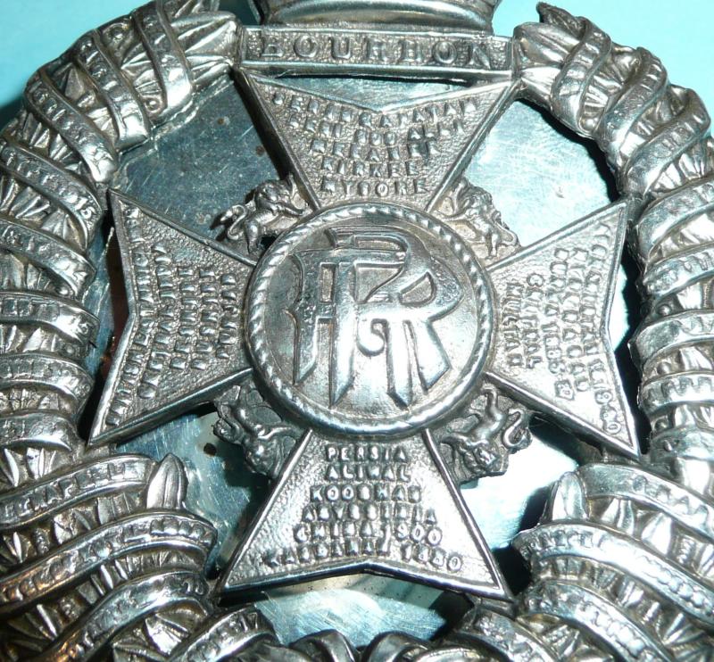 A good scarce silver plated cast example. Within a crowned laurel wreath festooned with battle honours, a Maltese cross with battle honours on each arm and lions between the angles. The centre, the monogram RR within a roped circlet on a seeded ground. Four screw posts to the reverse, complete with backing plate, but with only one original fastening nut remaining. In good condition but the some polishing to detail on the highpoints and battle honours. King's crown. Circa 99mm tall and 76mm wide. Scarce.