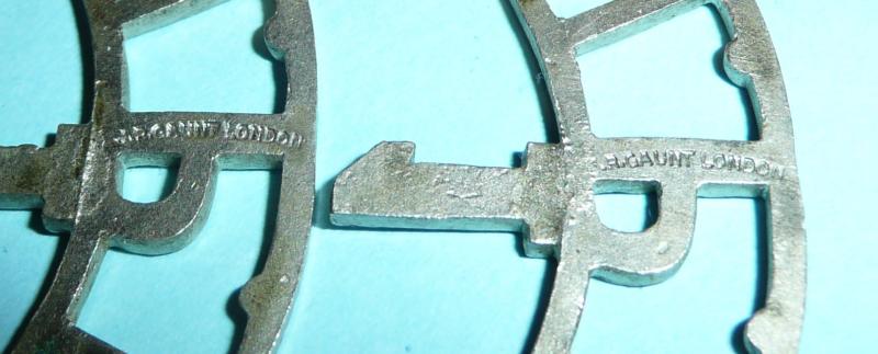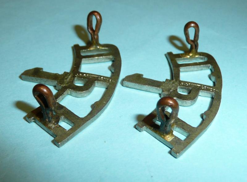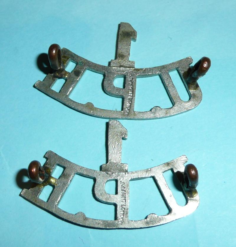 White metal shoulder titles, a matched pair in the form of the curved initials of the unit, surmounted by a '1'. With two original loops to the reverse of each and both maker marked JR Gaunt London. UK made. Most probably officers' issue. Scarce. Worn 1909 - 1917 only.