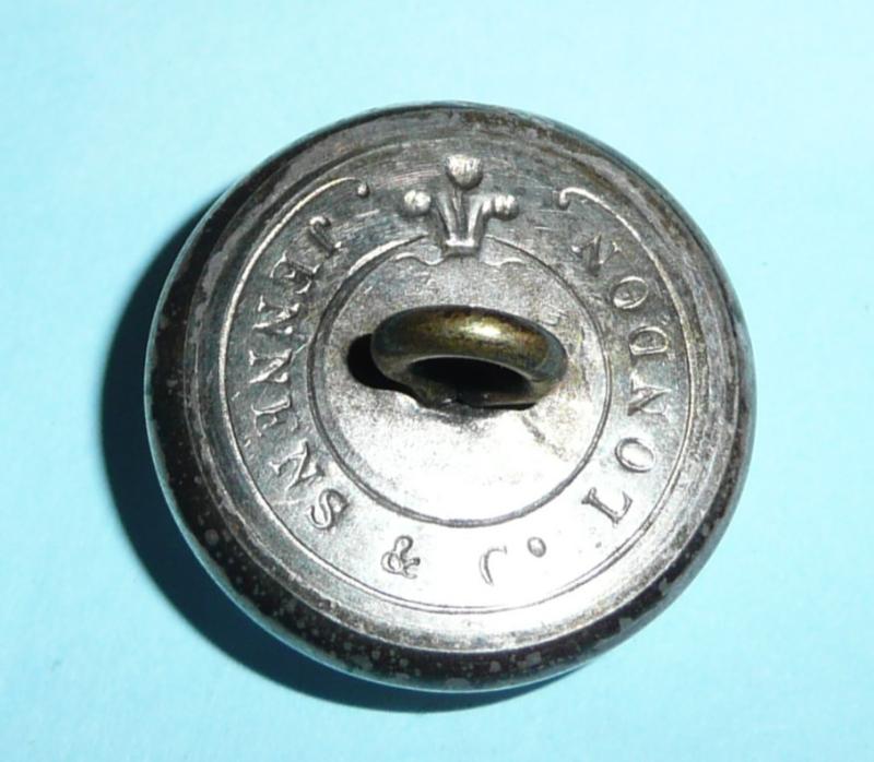 Circa 25mm in diameter, fixed shank and maker marked Jennens & Co, PoW feathers, London. King's Crown. A stunning silver plated example. Some tarnishing.