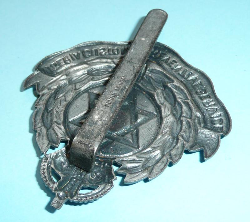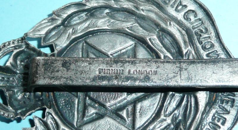 A large oxidised white metal die struck cap badge with original slider, King's crown, pre 1952. Maker marked Firmin London. In very good condition. Not in Renfrew et al, Vols 1 and 2.