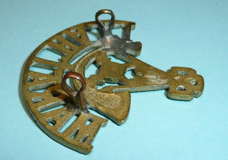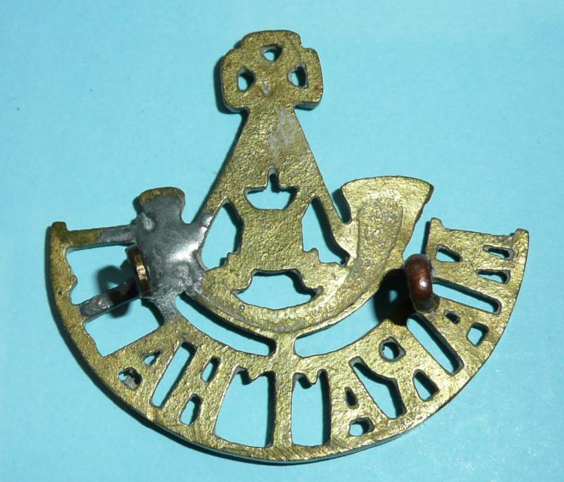 A one piece shoulder title in cast brass with two loops to the reverse, one is a replacement afixed with a fair amount of solder otherwise in very good condition. As worn from 1950 with the Maratha shield and crossed swords to the centre of the bugle. Prior to 1947, the Regiment was known as the Mahratta Light Infantry.
