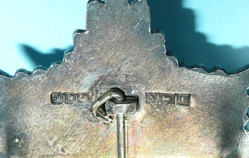 A large three part construction cap star, die cast and maker marked JRG (JR Gaunt) with Birmingham assay silver hallmarks for 1970 (date letter V) with enamel to strap and centre cross in very good condition. Two original long silvered loops to reverse. Silver finish dark toned, slight service wear. An example with a bit of age to it (now over 50 years!). Circa 5.4cms tall.