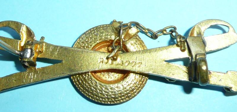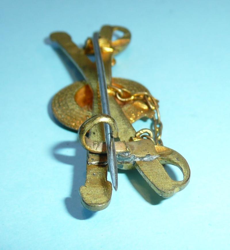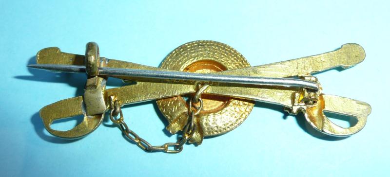 Registered Design present but hard to read, but most probably for the either the year 1914 or 1915. In the form of a sailor's straw boater hat to the centre of crossed naval cutlasses / swords mounted with glass stones of red, white and blue. Original and functional pin fitting. Gilt bright. In very good condition for age and an attractive piece.