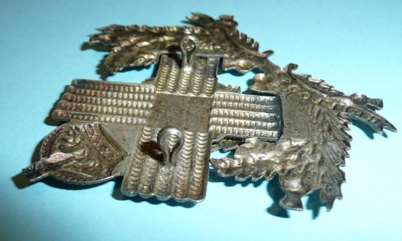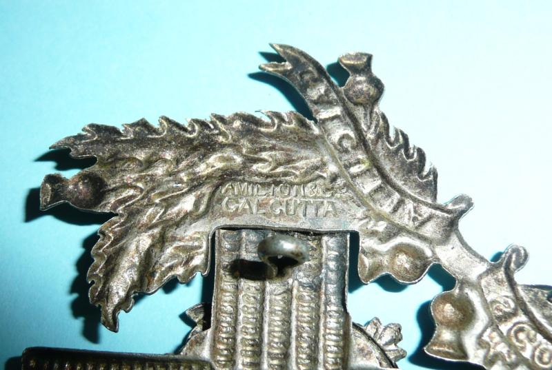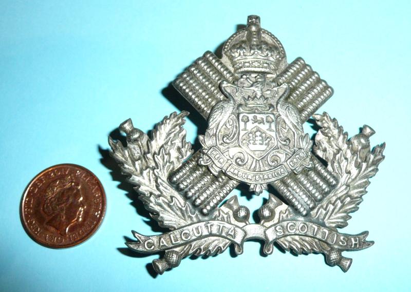 Of two part die struck and overlaid construction with two original silvered loops. and maker marked Hamilton & Co. Calcutta to reverse. In very good condition with all fiddly bits present and correct. Raised in 1911, re-designated in 1917 as the 44th Calcutta Scottish and in 1920 as the Calcutta Scottish. Lovely design to centre. Scarce.