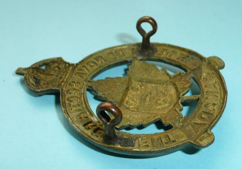 A gilding metal die struck example with two original loops to the reverse. Circa 48mm tall it is cap badge size but smaller than the example shown in Cox. Could be a collar badge, happy to be corrected.