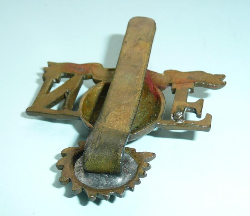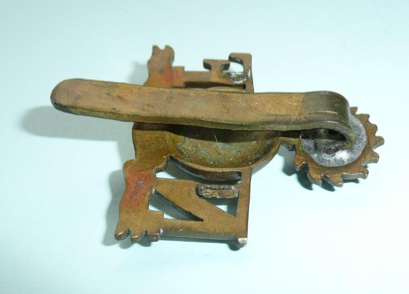 Hexagonal fixings neatly removed and a slider has been soldered into the reverse. Not sure the intention, OCA item or possibly done to the shortage of cap badges for the service battalions formed rapidly in the early days of WW1. Sold as seen.