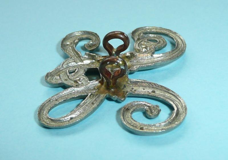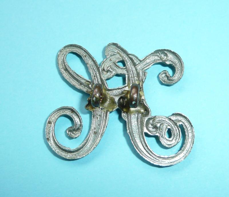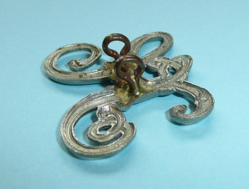 A monogram of entwined letters F and C linked in open script, die struck with two original loops to the reverse. Worn on either side of the collar with separate numbers to the each side. These were also worn on the shoulder epaulettes surmounted by a separate Tudor crown. Circa 25mm tall. In very good condition. This pattern no longer worn.
