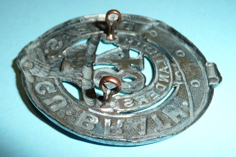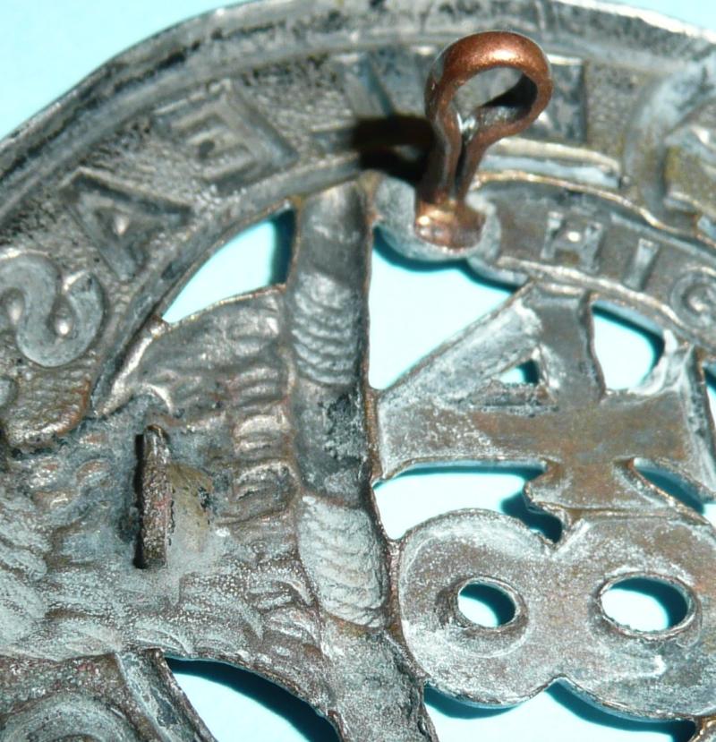 A large die struck glengarry cap badge, silver or nickel plated to front. Slider appears to have been neatly removed and replaced with two loops (e-w) to the reverse. Circa 5.6cms tall. In good overall condition. Worn 1904 - 1920.