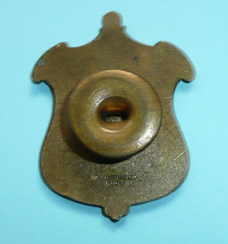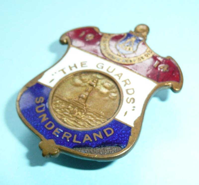 A very rare original First World War period 'The Guards Sunderland 1914 badge'; large gilded brass shield inlaid with patriotic red, white and blue enamel around a central recessed disc with the arms of Sunderland: an embossed brass lighthouse, the top tip depicting a sextant within a heraldic shield, surmounted by a ball on torse and horseshoe scroll below bearing the Latin motto 'Nil Desperandum Auspice Deo' (With God as our leader there is no cause for despair); the reverse impressed with maker's details "Vaughtons Ltd Birm" Good condition, retaining original early style round buttonhole fitting, enamel loss to bottom right, service wear to gilt finish, back to brass. Circa 42mm tall.