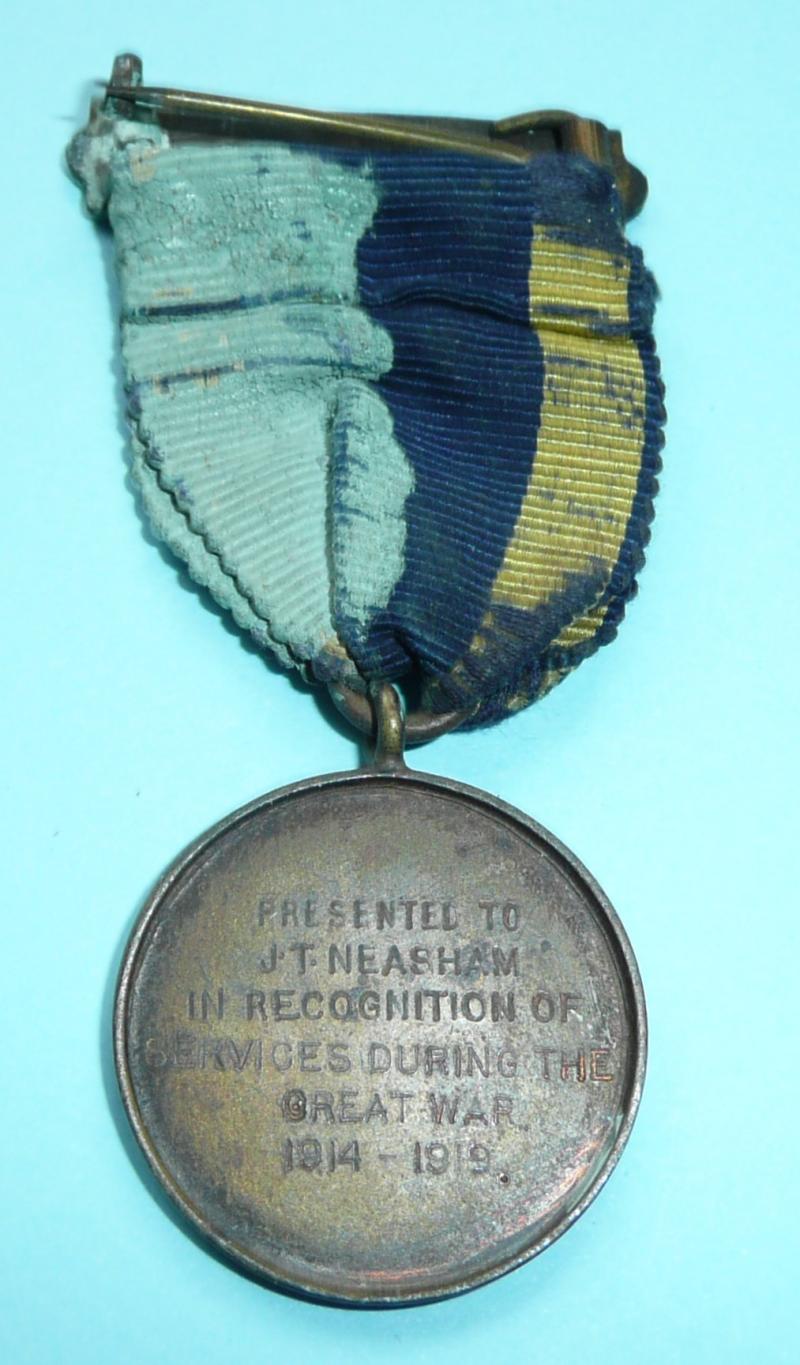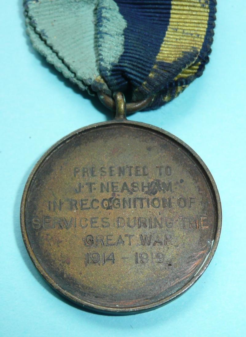 A small bronze medal on its original ribbon with original top bar and original pin fitting, named to recipient on reverse in recognition of services in the Great War. Some wear to ribbon and medal a little bit grubby to reverse.