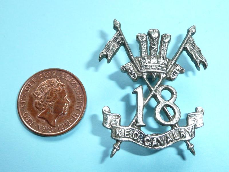 The badge is in the form of the regimental number, '18', on the intersection of two crossed lances with, above, the Prince of Wales's feathers, coronet and scroll, with the motto, 'Ich Dien' (I Serve); below, a scroll bearing the unit title, 'K.E.O. Cavalry'.