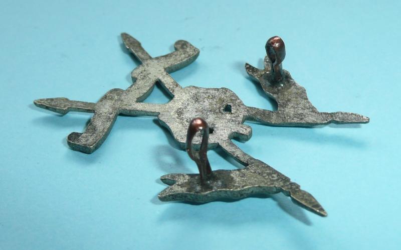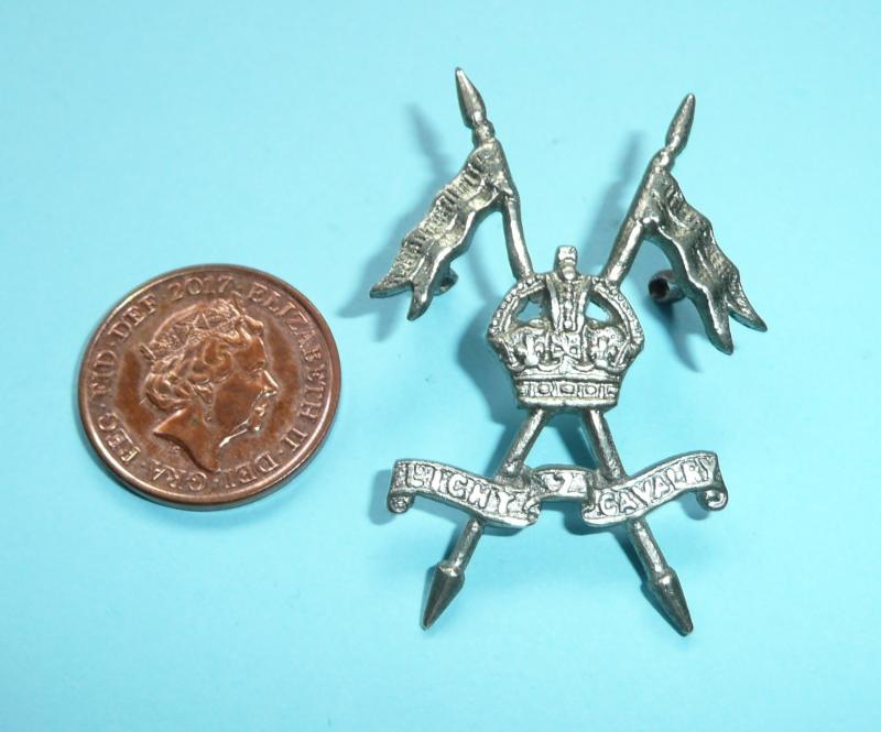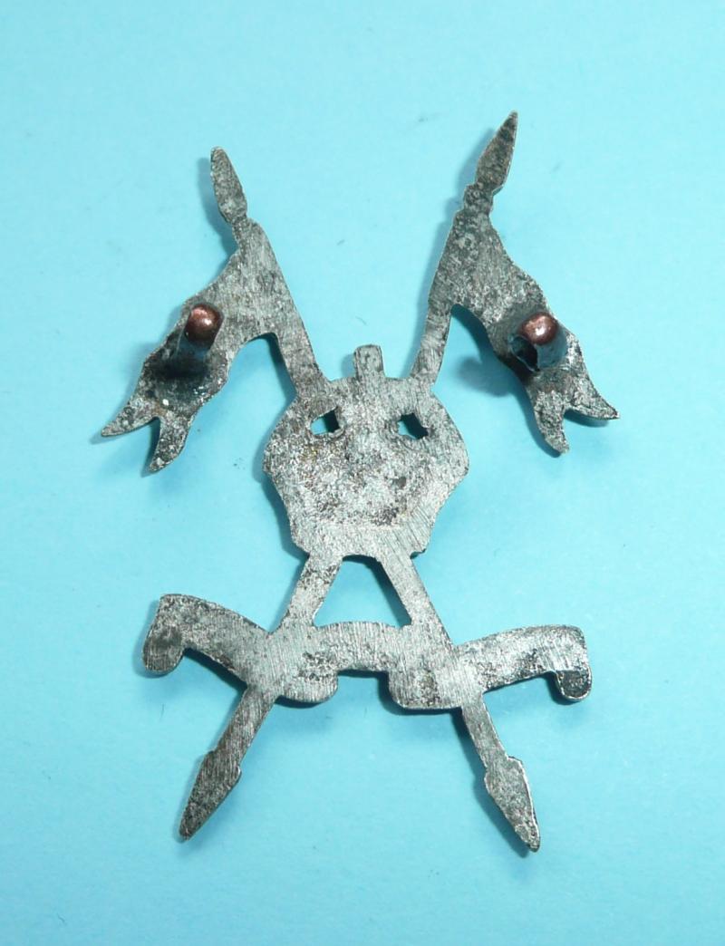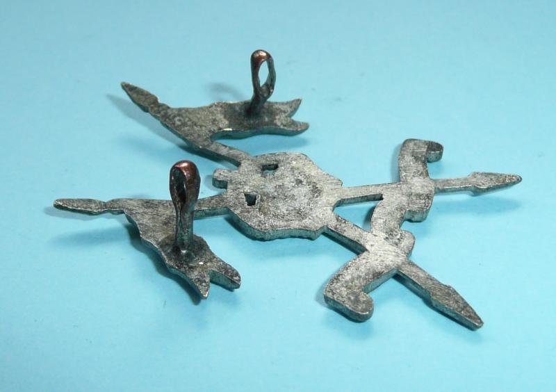 In the form of crossed lances and pennons, with a Tudor (King's) crown at the intersection of the lances. Below a scroll inscribed "LIGHT 7 CAVALRY". Loops original but pinched and twisted. As worn from 1930 until circa 1950.
