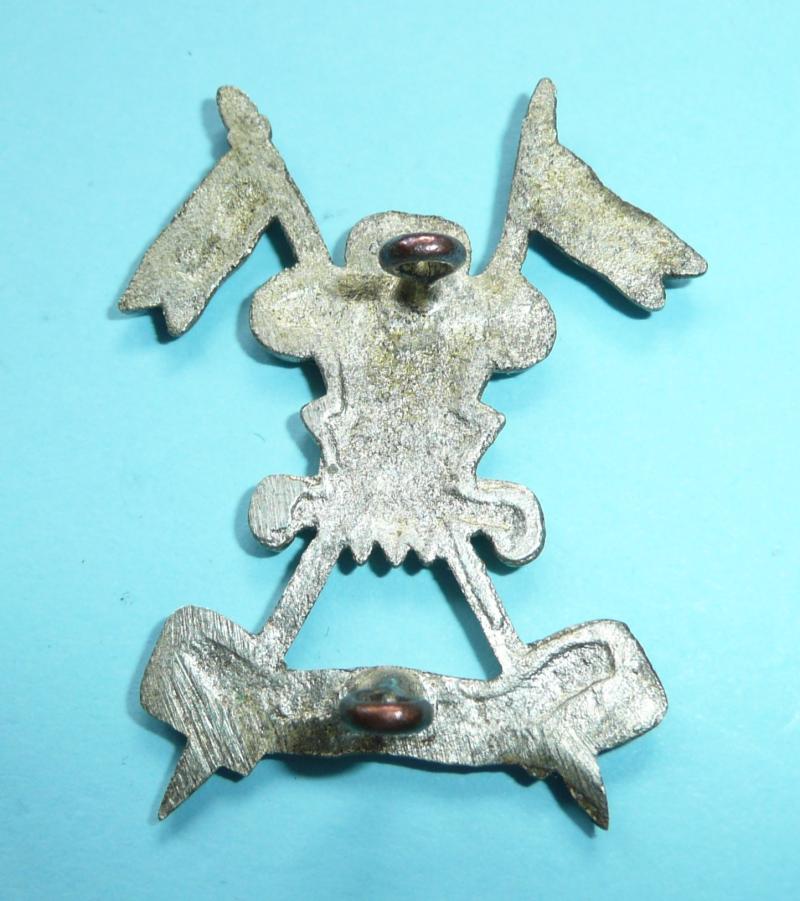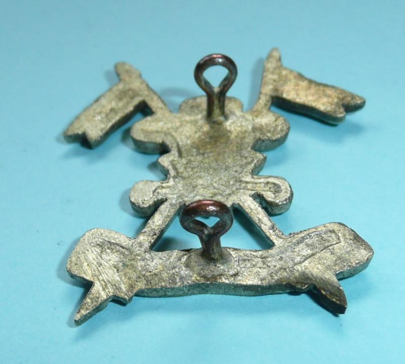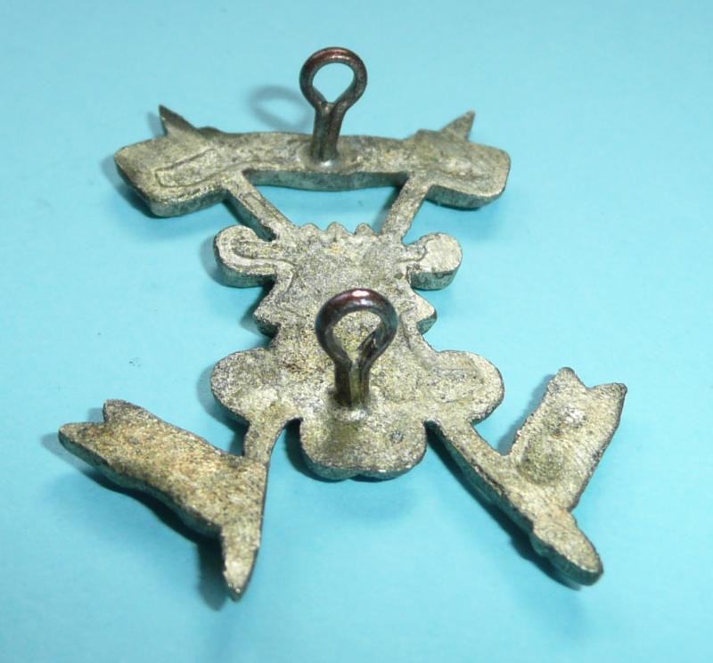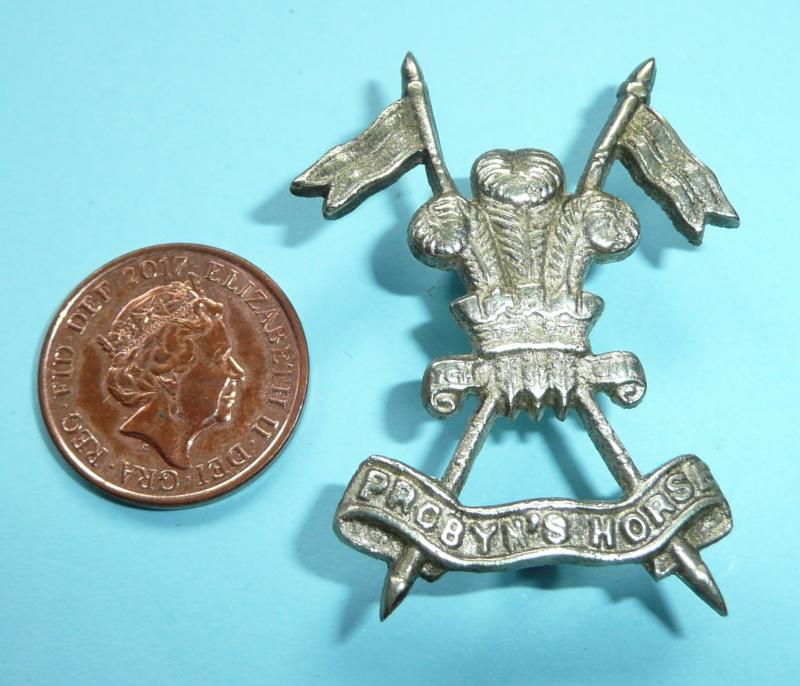 A finely cast white metal badge (silver plated) with two original loops. Prince of Wales's feathers at intersection of crossed lances, scrolls below with motto, 'Ich Dien', and the unit title, 'Probyn's Horse'. Worn circa 1921 - 1947.