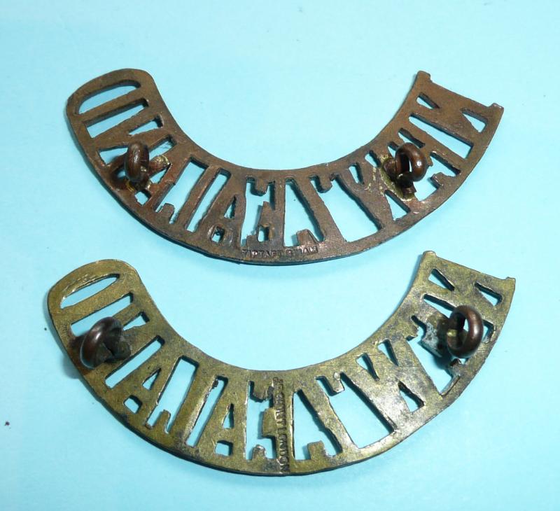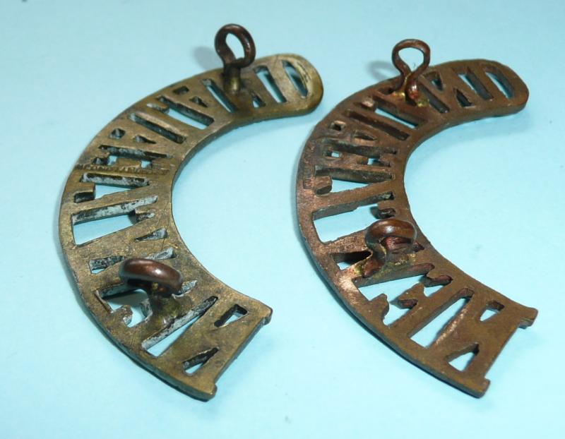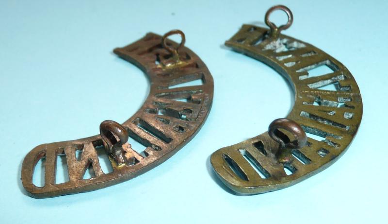 A pair (non matching) of brass shoulder titles, actually quite hard to come by. Two original loops to the reverse of each and both maker marked JR Gaunt London. Some service wear to titles and loops. Generally good condition and scarce.