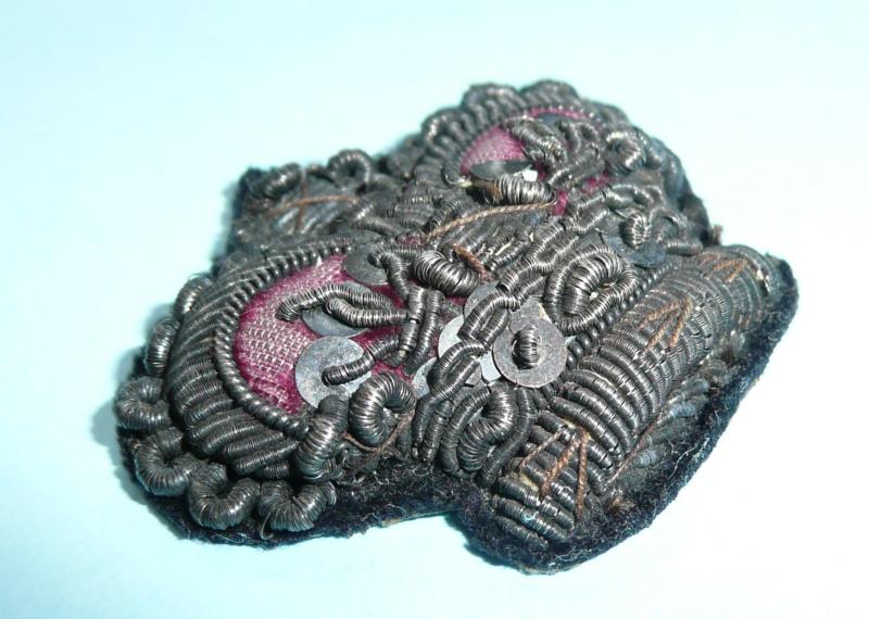 Circa 40mm wide and 32mm tall, a deeply padded example, removed from uniform. Silver bullion thread tarnished and slight damage to sequins, with wear to maroon velvet backing to crown, black felt backing. Scarce.