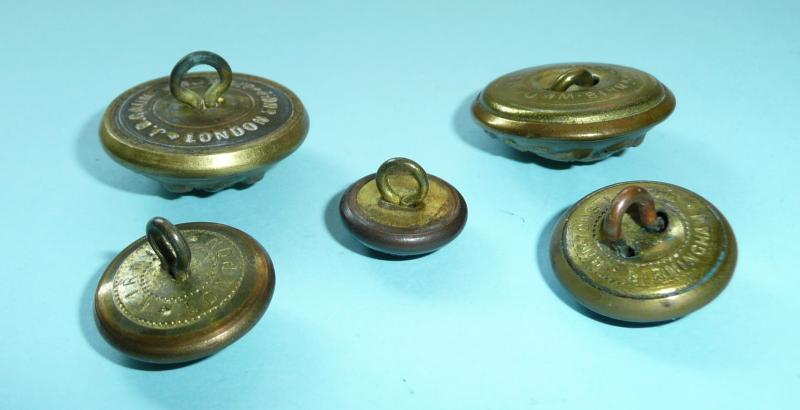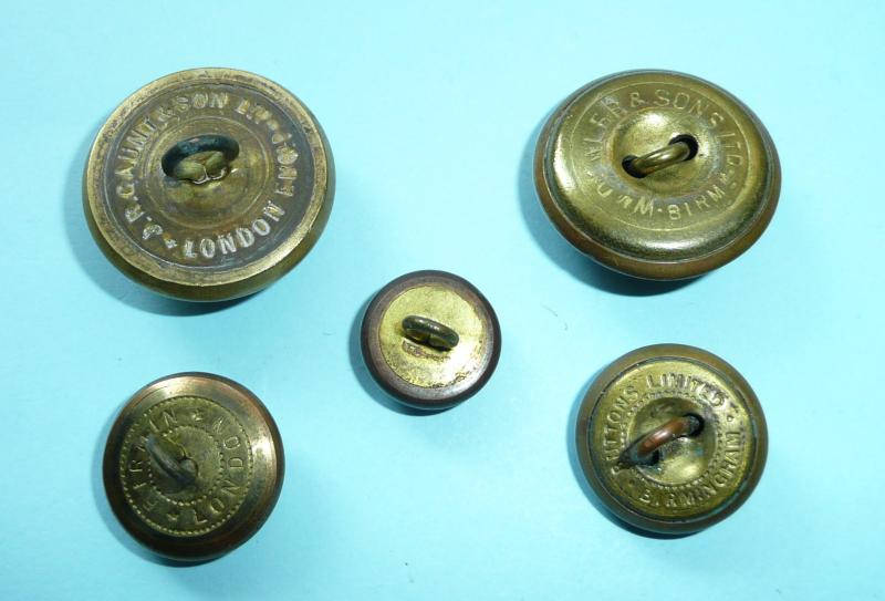 5 different buttons, a pair each of officers and other ranks buttons of large and medium pattern size, post 1902 pattern and a small and scarce early pattern bronzed OSD cap button worn until 1902. Some dulling and tarnishing otherwise in good condition.