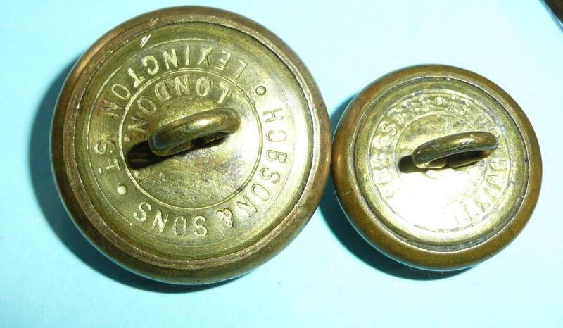 Some service wear and loss of detail from service wear on the smaller of the two, gilt finish back to brass otherwise in good condition with fixed shanks and both maker marked Hobson. Circa 26mm and 19mm in diameter.