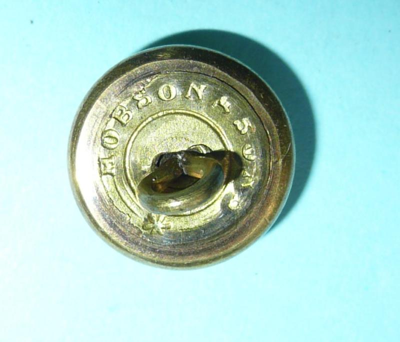 Silver plated device mounted on small gilt button. Maker marked Hobson. Circa 14mm in diameter. Gorgeous. K79.3