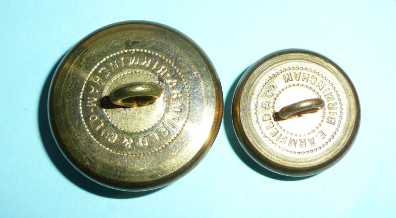 A stunning pair of officer's buttons, both maker marked Armfield and Co, Birmingham. Fixed shanks. Circa 26mm and 19mm in diameter respectively. Gilt bright, near mint. You won't find better!