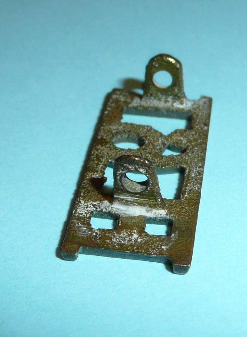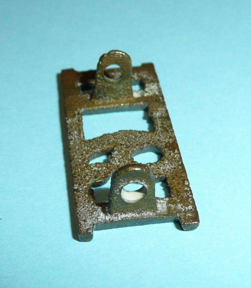 A rare theatre made sand cast example, presumably in India when the Regiment was stationed there, with two original integral fixing loops to the reverse. Quite a bit smaller than its UK made counterpart as illustrated in Westlake (No 176). Circa 13mm tall and 30mm wide. The UK made pattern is 14mm tall and 35mm wide (see my item 62065).