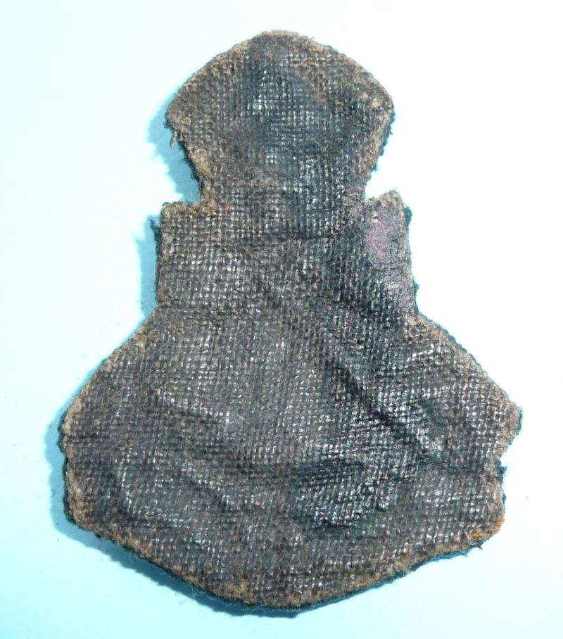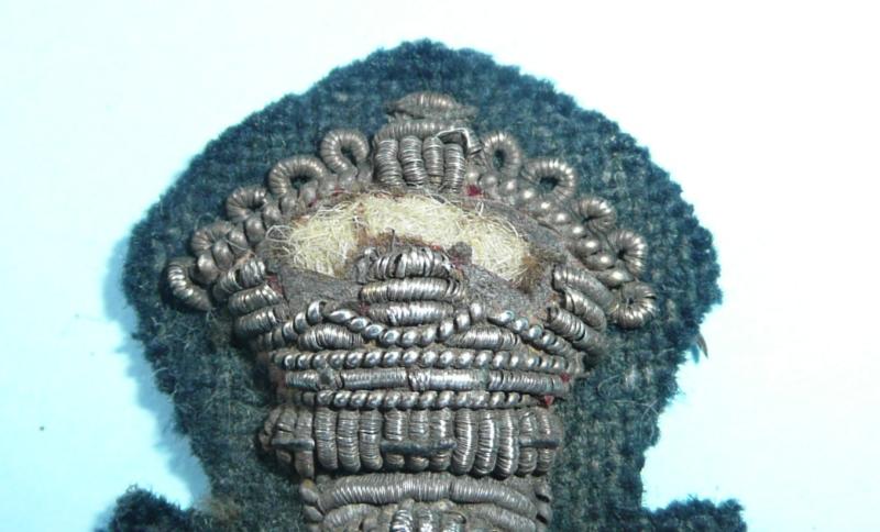A silver bullion and silver wire embroidered example. Black paper backing to the reverse intact. In good overall worn condition with the exception of damage to the felt insert in the centre of the coronet (see photos). This pattern was worn from 1902. Circa 5.8cms tall including the green felt backing. A scarce badge despite the damage.