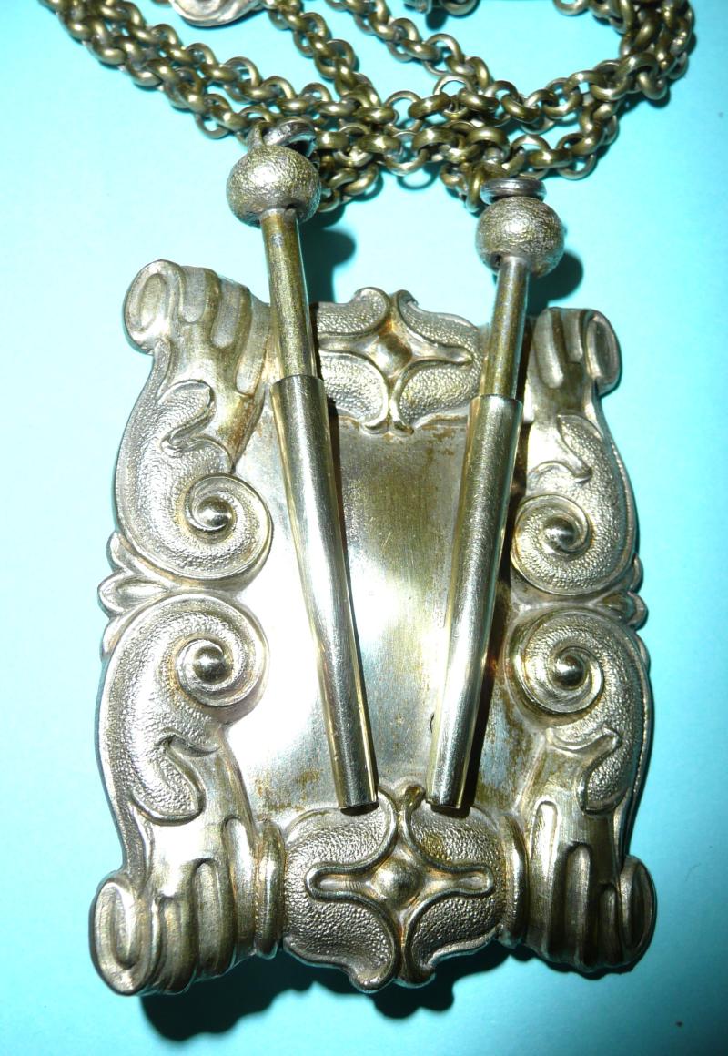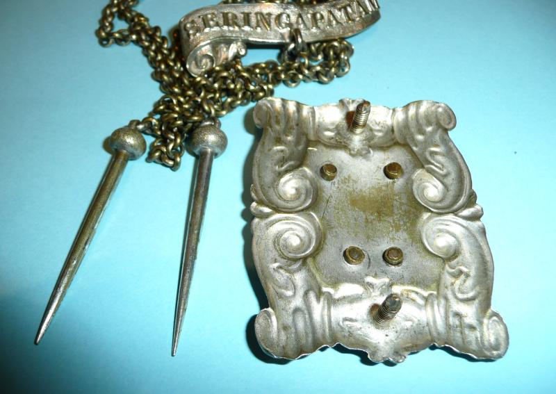 A white metal set of officer's prickers of ornate rectangular form with two prickers with acorn finials, attached to a double white metal chain anchored to a single point on a decorative curved and floreated scroll with the embossed battle honour 'Seringapatam'. Complete with brass securing posts to both parts. Retaining nuts no longer present. This would have been fitted to the front of the cross pouch belt worn by both European and native officer's during the Victorian and Edwardian Period, by which time the prickers were purely an ornamental feature. Originally they were issued to light cavalry to disable enemy cannon. The pricker would be hammered into the cannon's touch-hole so that it could not be fired.