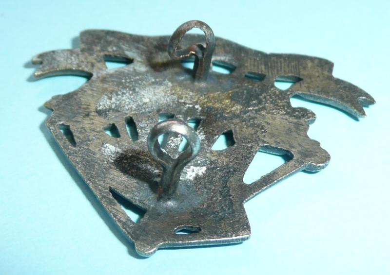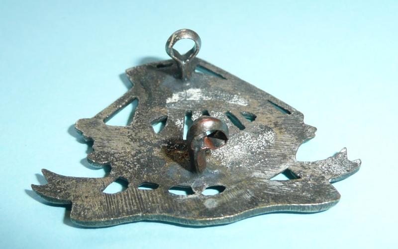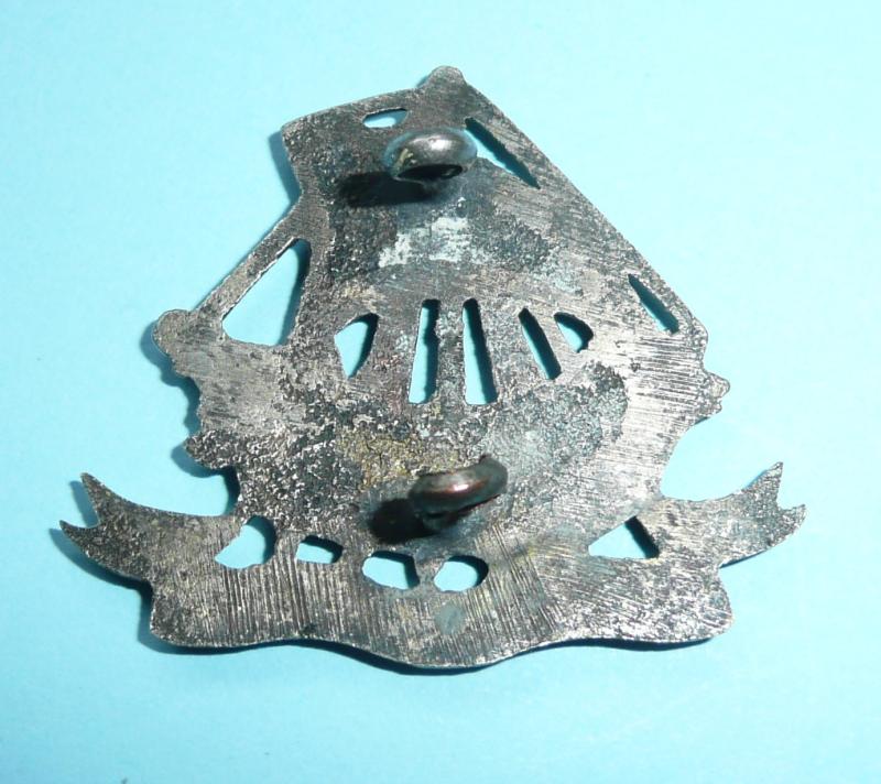 An theatre cast example with two integral loops. Appears to have been silver plated. A Galley ship under sail with rowing oars deployed resting on a scroll inscribed "2nd PUNJAB REGIMENT".