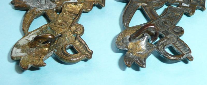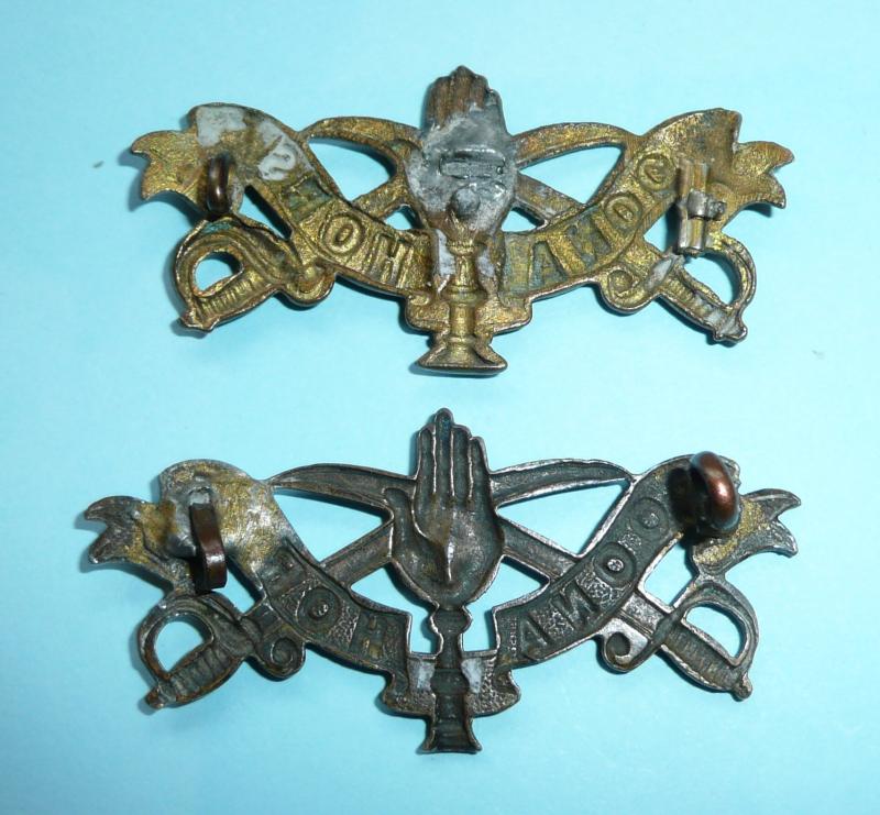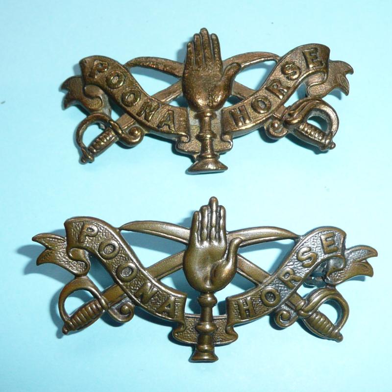 A pair of non matching die struck shoulder title badges (one looks gilt brass and the other bronze), but they display reasonably well together from the front. The badges are in the form of a finial in the shape of an upraised hand superimposed on crossed sabres and a scroll bearing the unit title, 'Poona Horse'.
