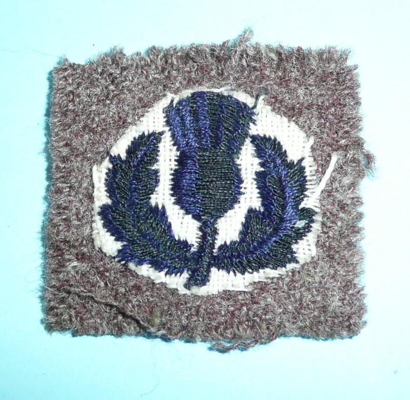 From its establishment in 1859, The London Scottish wore Hodden Grey uniforms with dark blue facings until 1914. In Khaki and on Battledress they wore a a Hodden Grey square with a dark blue thistle to commemorate this. Removed from uniform. slightly raggy edges otherwise in good condition and early. Scarce.