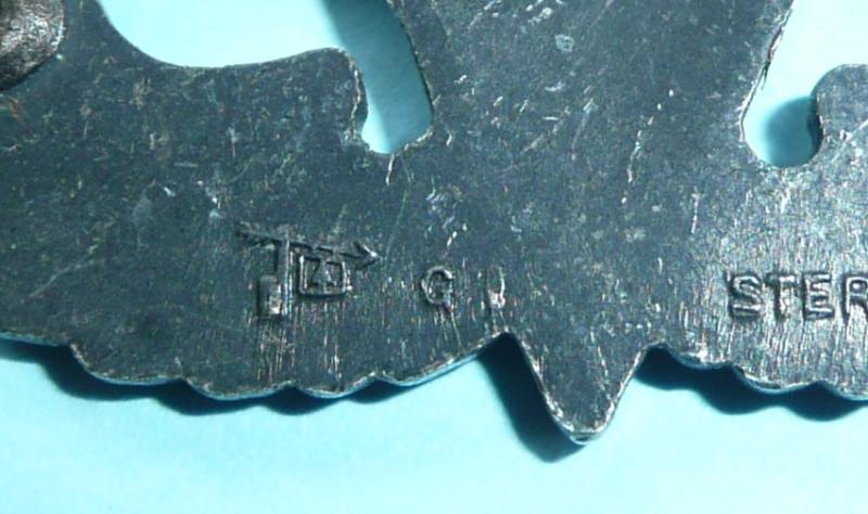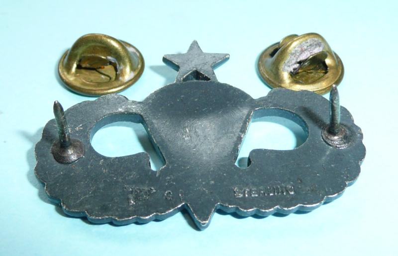 Die cast in sterling silver - The star is in the same die strike as the rest of the wing. Circa 4cms (1 1/2 inches) across in size. Maker marked on the reverse side with a logo and "G1", also marked "STERLING". There are two clutch back posts on the reverse side with pinch type of friction keepers. 1950s onwards.