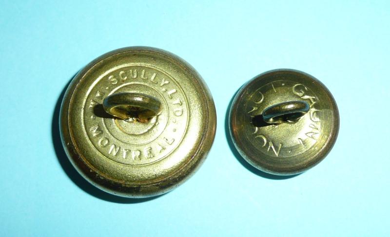 Circa 25mm and 18mm in diameter, fixed shanks, maker marked DWm Scully Montreal and Gaunt London respectively. Gilt bright, slight colour variation given different makers.