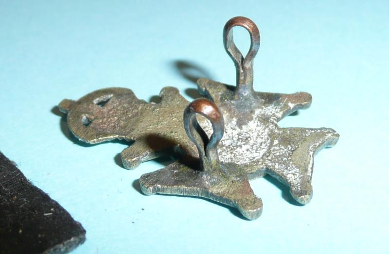 A small silver plated Royal Garhwal Rifles officer's field service cap badge, in the form of a King's crown above Maltese cross with regimental details in circle to centre and strung bugle. Circa 28mm tall with two original copper loops and mounted on an old piece of shaped blue backing cloth, added for display. Scarce. Worn circa 1922 - 1950. Allocated to India following Independence.