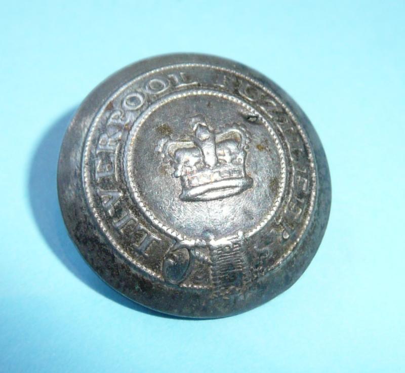 Silvered buttons are known, 18 mm in diameter. The raised design shows a garter with beaded edges inscribed “LIVERPOOL FUZILEERS” in Roman capitals, enclosing a crown.