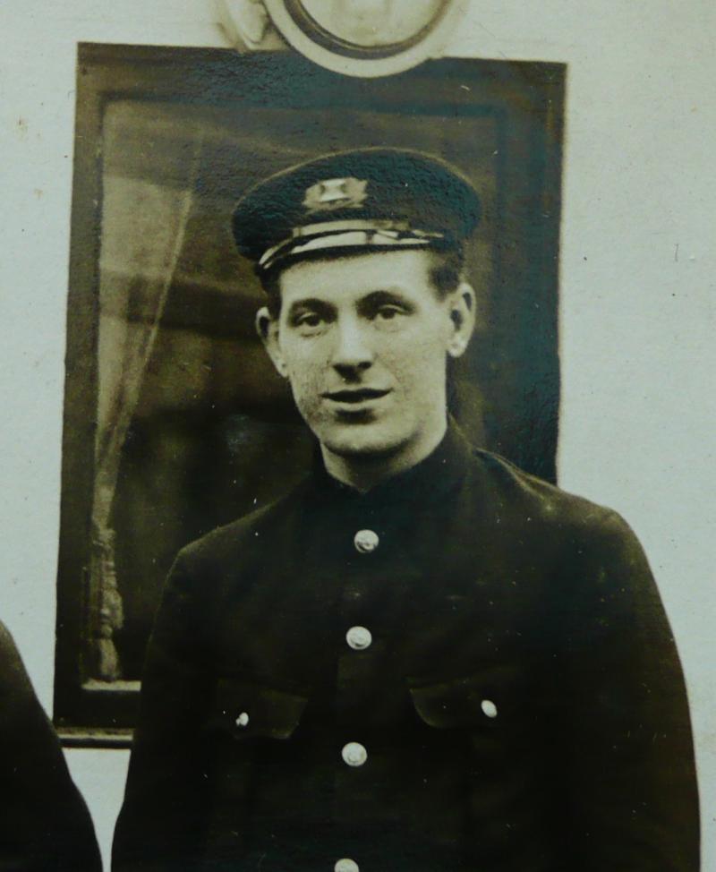 The badge worn by the four figures flanking the Master, appears to be a crenelated tower on a bullion wreath. Any information on identity of shipping line in question, most welcome.