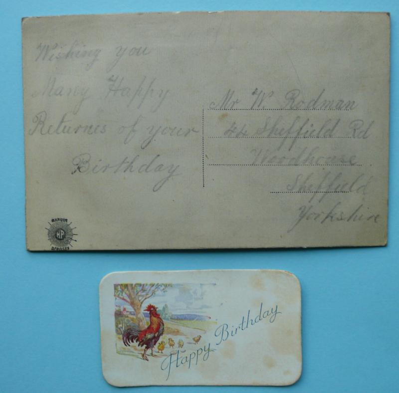 Postally unused put pencil message to reverse. French maker. Some mild foxing to front but still in its original protective envelope. Used as a birthday greetings card for a Mr W Rodman, and addressed to a Miss Mary Rodman at 44 Sheffield Road, Woodhouse, Sheffield in Yorkshire. In very good condition for age with with the flags of the Allied Nations.